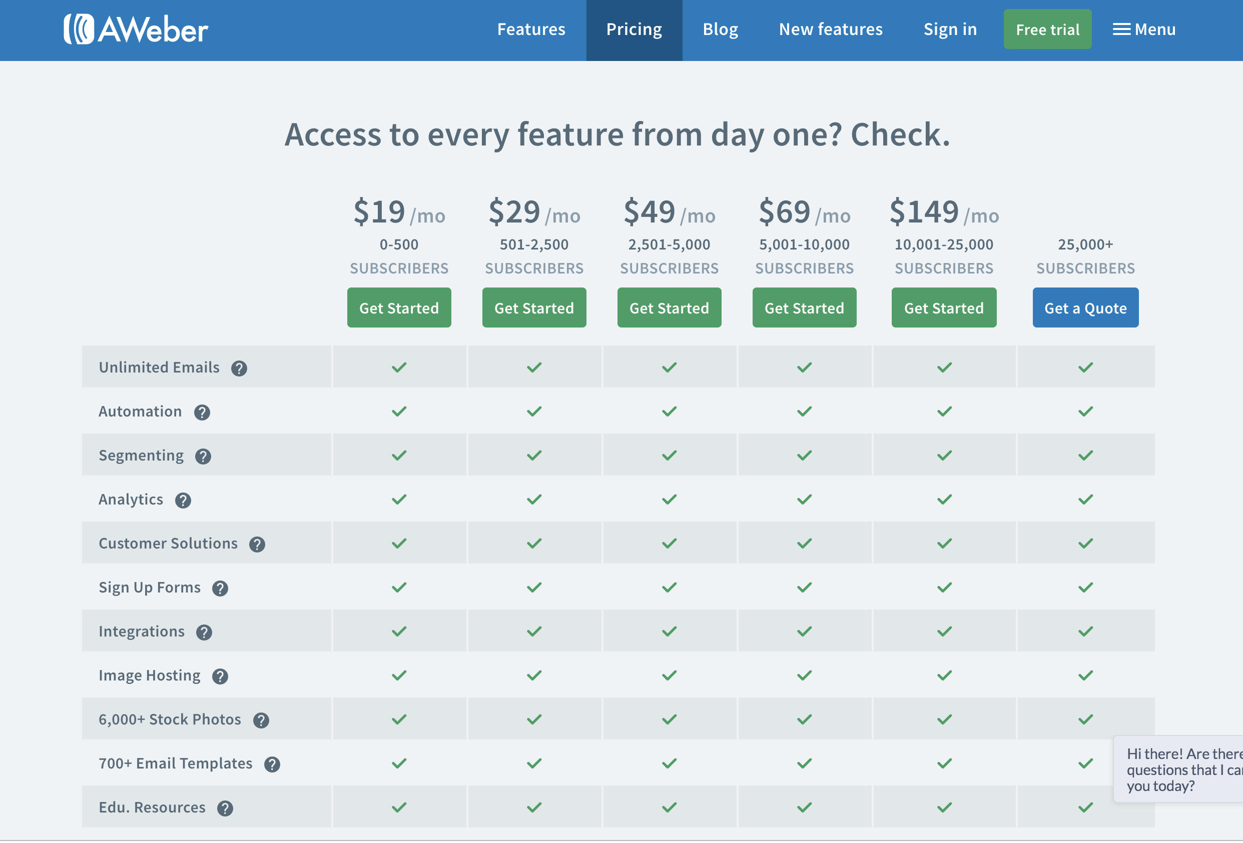 AWeber is a great tool for creating, sending out, and analyzing emails to build your email marketing campaigns. There are six different plans available. You can also try it out for 30 days before deciding on which plan you want to pay for. The number of subscribers seems to determine the monthly subscription cost. If you are just starting out, you can begin with the $19.00 a month plan, which allows for up to 500 mailing list subscribers. If you have 501-2,500 subscribers you will need up upgrade to $29.00 a month. Next up is for 2,501-5,100 subscribers at $49.00 a month. Once you have 5,001-10,000 subscribers on your list, you’ll need to start paying $65.00 per month. For big enterprises with 10,001-25,000 subscribers, you’ll need to pay $149 per month, but that won’t be a problem since you are mostly making plenty of money from all of those subscribers. *If you have more than 25,000 subscribers you will need to ask for a quote from the AWeber team.